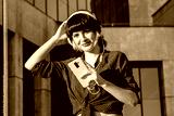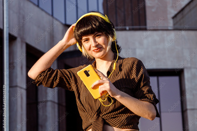 Young white woman listening to music outdoors. Short hair, golden hour, looking to the camera
