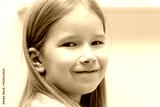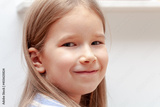 Happy cheerful school age child, little girl smiling, young kid smiles, portrait, face closeup detail, interior. People, lifestyle, caucasian children portraits. Happiness concept, one person