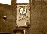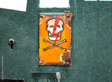 Electricity, high voltage warning sign, old fashioned worn out retro metal plate with skull and bones, lightning symbol, grunge. Danger concept, electric power life threat, object detial, nobody
