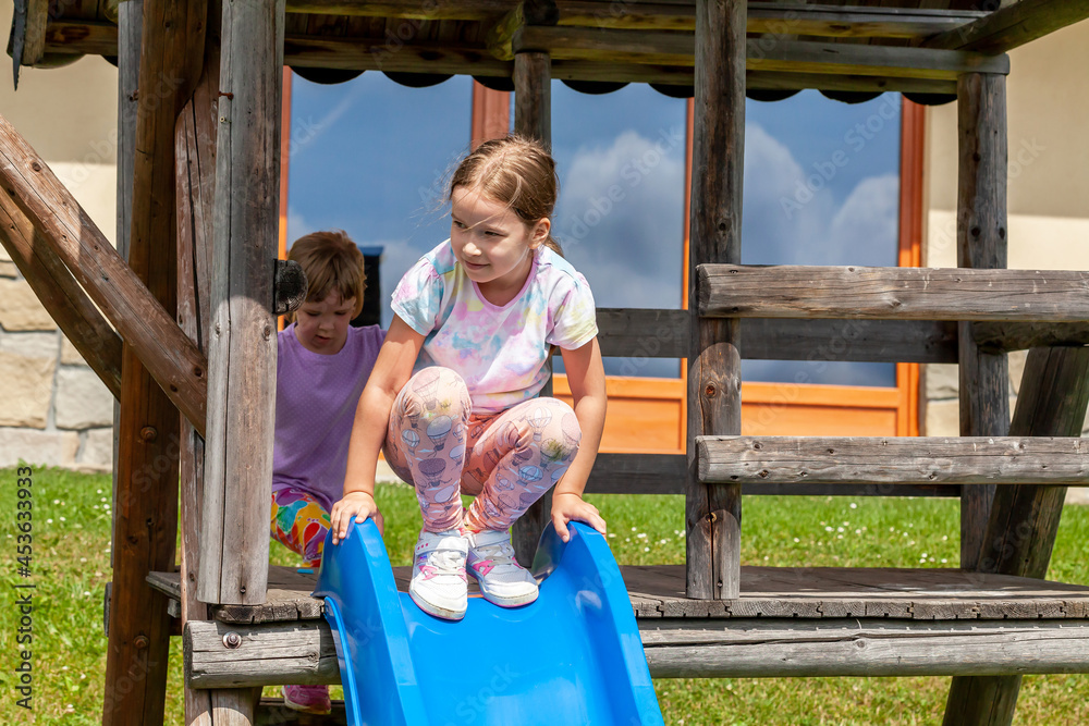 Healthy happy active young school age children, cheerful girls, sisters playing outdoors on the playground slide natural lifestyle shot. Siblings togetherness, friends, kids having fun outdoors