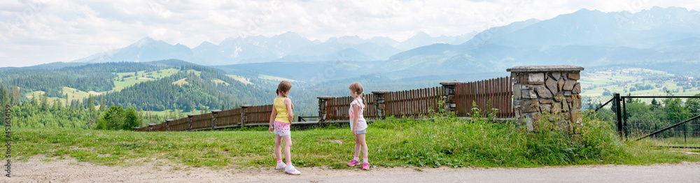 Two young little school age girls looking at Tatra Mountains range, exploring, Tatras Polish side, high resolution HQ panorama. Travelling, Europe trip journey destinations, holidays, vacations
