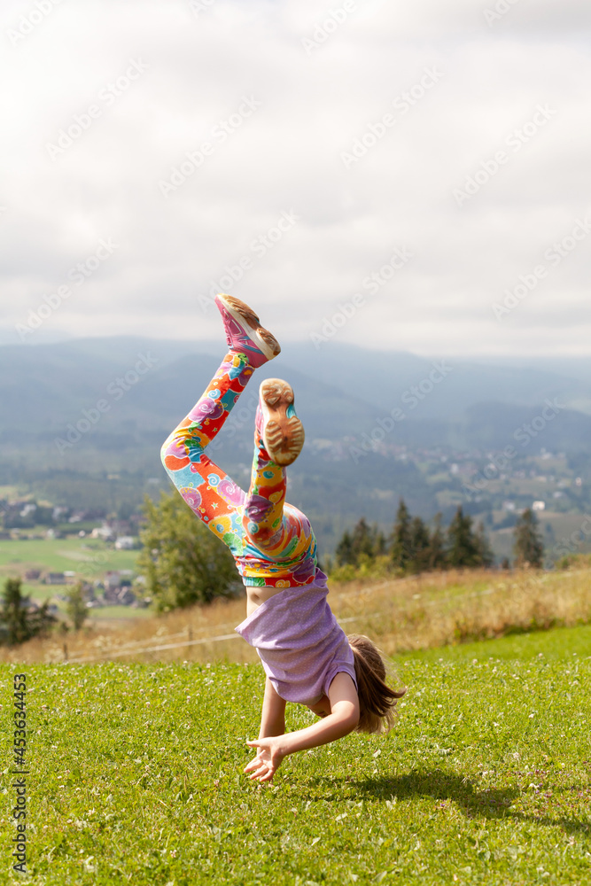 One little girl, young school age child playing outdoors, kid falling over, fall down, accident during play time outside Children playtime safety, safe acrobatics exercise, kids lifestyle, one person