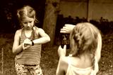 Two young little children, school age kids using electronic gadgets, kids and technology outdoors shot. Smart fit band and a smartphone, taking photos with a mobile phone concept, people, lifestyle