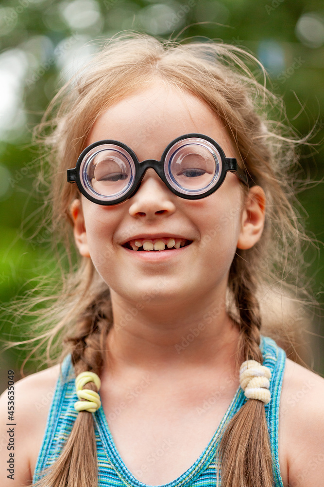 Happy cheerful young little school age girl, one single child in quirky funny big silly glasses smiling laughing, vertical outdoors portrait simple face closeup. Fun concept, people children lifestyle
