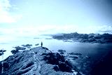 Amazing epic shot of young man hiker stand on top of mountain after long difficult hike in Lofoten Islands in Norway. Incredible summer views of scandinavian travel lifestyle. Epic landscape in north