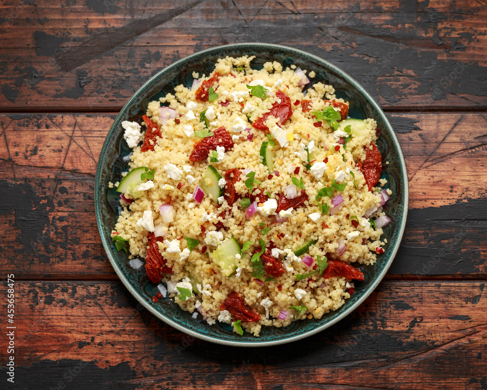 Couscous salad with sun dried tomatoes, cucumber, red onion and feta cheese. healthy food.