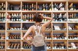 Back view puzzled minded young woman in casual clothes shopping at supermaket grocery store buy choosing wine alcohol bottle scratch head inside hypermarket. People purchasing gastronomy food concept.