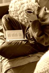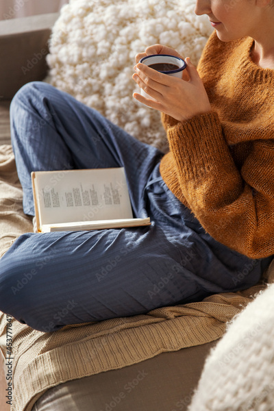 people and leisure concept - young woman drinking coffee and reading book sitting on sofa at home