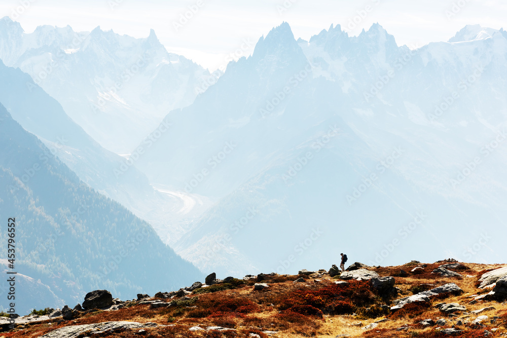 Amazing view on Monte Bianco mountains range with with Monblan on background. Vallon de Berard Nature Preserve, Chamonix, Graian Alps. Landscape photography