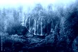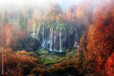 Aerial view on amazing foggy waterfall in Plitvice lakes