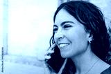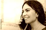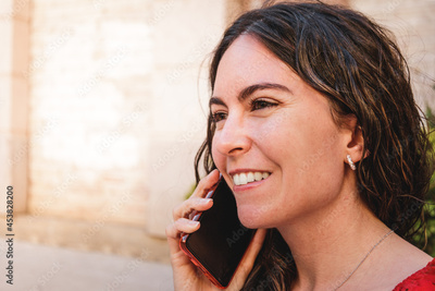 Close-up of spanish girl talking on a red smartphone with red sleeveless t-shirt and fringes. Summer outfit. Copy space