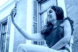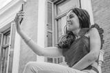 Pretty teen girl takes selfie or video call with red sleeveless t-shirt. Shot from above