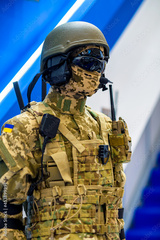Modern military uniform with weapons.