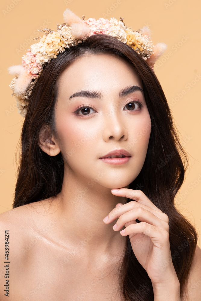 Beauty Asian young woman with big bouquet flowers on head smile with clean fresh skin Happiness and cheerful with positive emotional on Beige background,Beauty Cosmetics and Facial treatment Concept