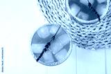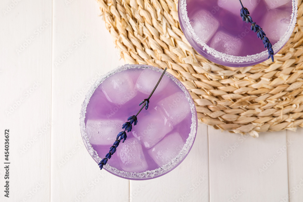 Glasses of fresh cocktail with lavender on light wooden background, closeup