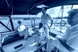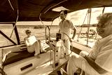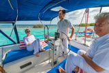 Senior couple and young man, family, enjoying sailing trip on a luxury summer holiday vacation, sunny weather and ocean in background, love and romance on a beautiful yacht