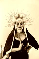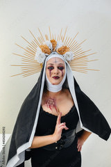 A young girl in a beautiful festive makeup and a scary nun costume for the Halloween holiday. Happy Halloween concept.
