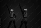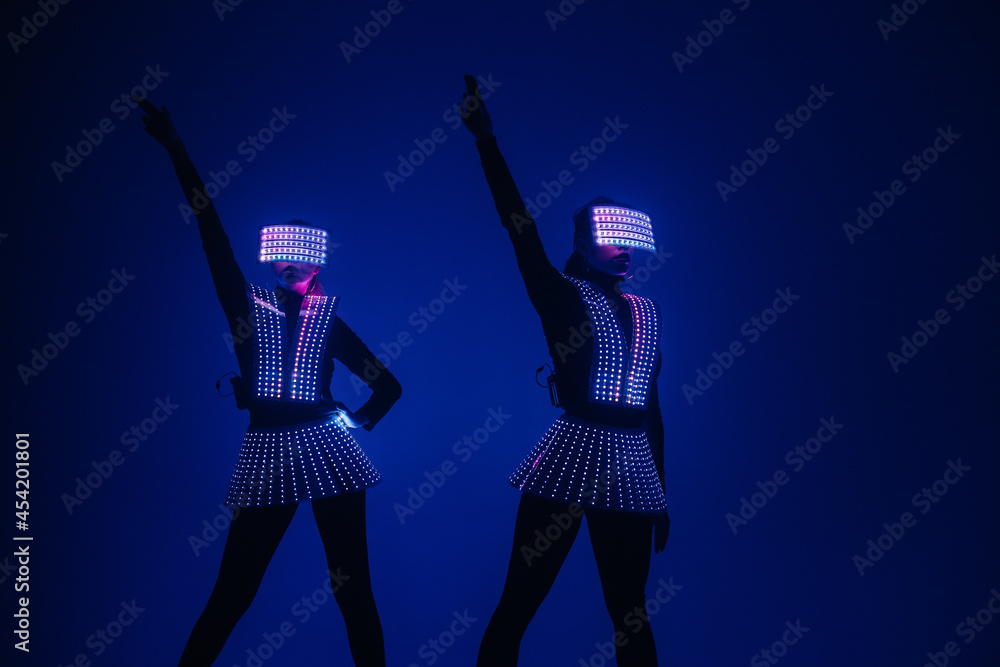 Two sexy disco dancers move in UV costumes. Parties and dances.