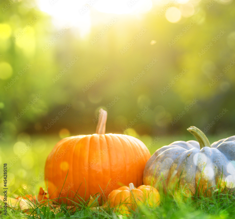 pumpkins on green grass background, autumn harvest and thanksgiving concept