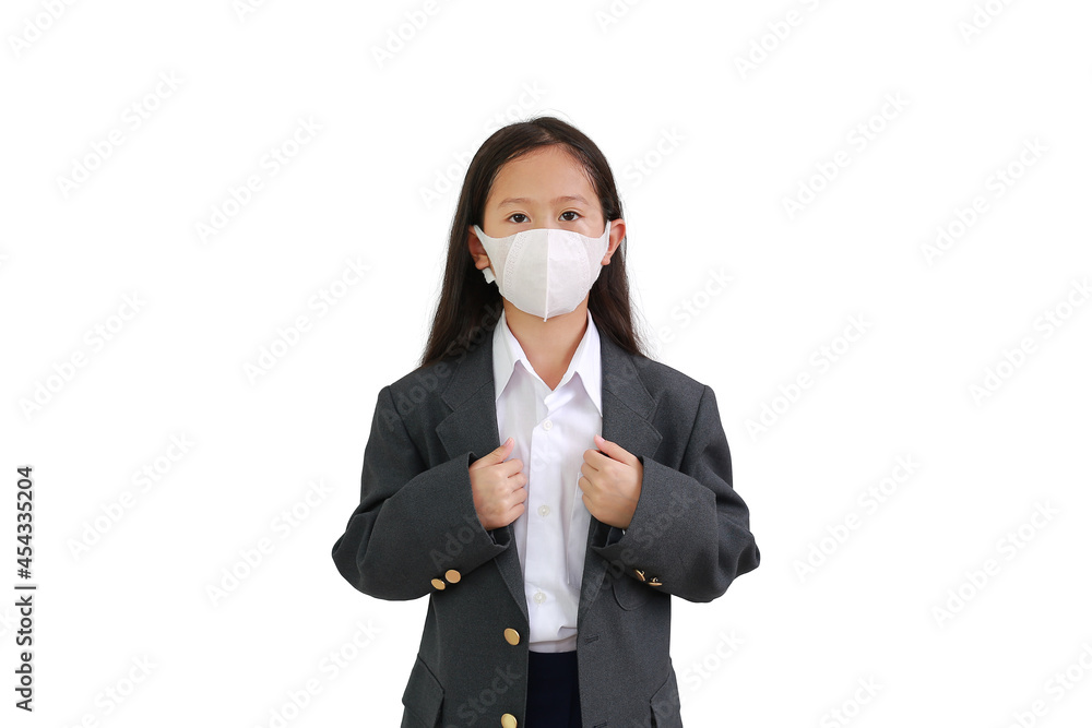 Asian little girl child wear formalwear shirt, student suit and protective face mask wearing and keep hands holding suit posing isolated over white background