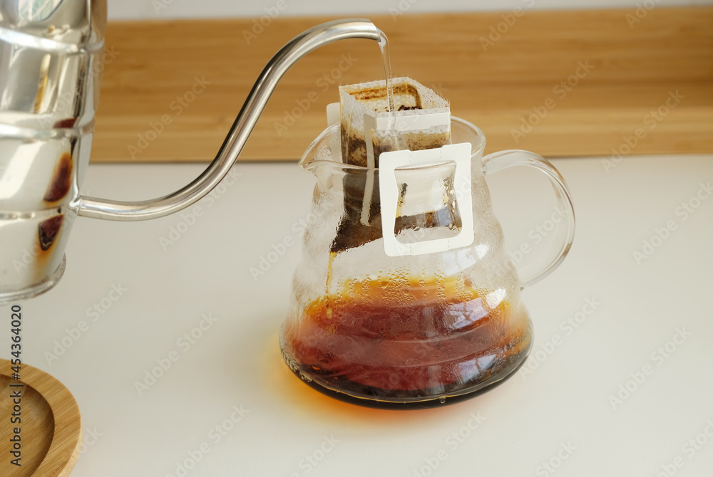 Drip bag coffee brewing process. Easy simple brew method, new trend