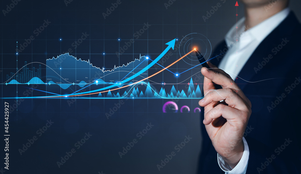 Businessman draw growth business graph progress and financial analyzing. Business development to success, profit and growing plan.