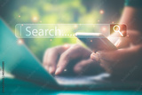 Hand man using laptop and Searching browsing data on the Internet online.network,media, keyword,Digital Web,Photo concept Searching information of and Technology.