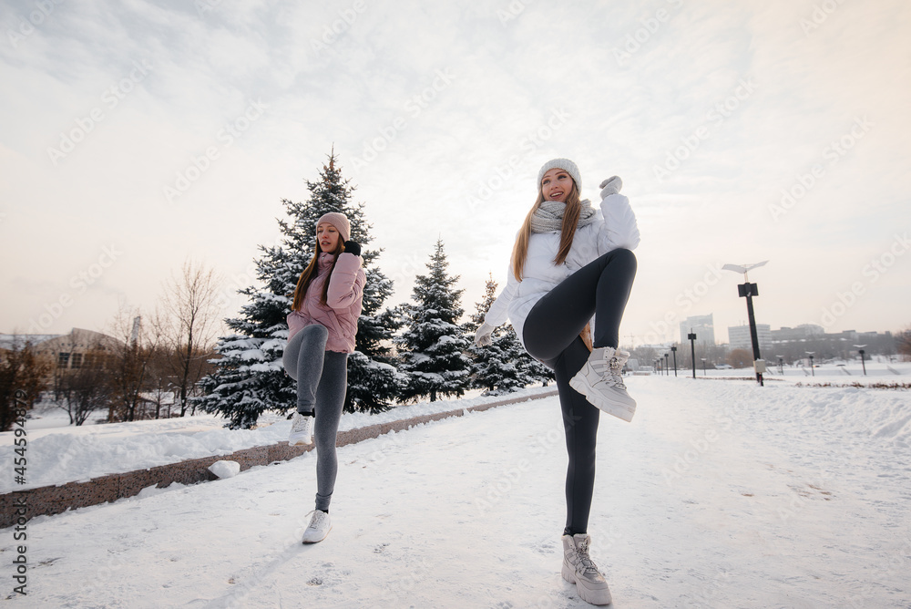 Two young athletic girls do a warm-up before running on a sunny winter day. A healthy way of life.