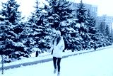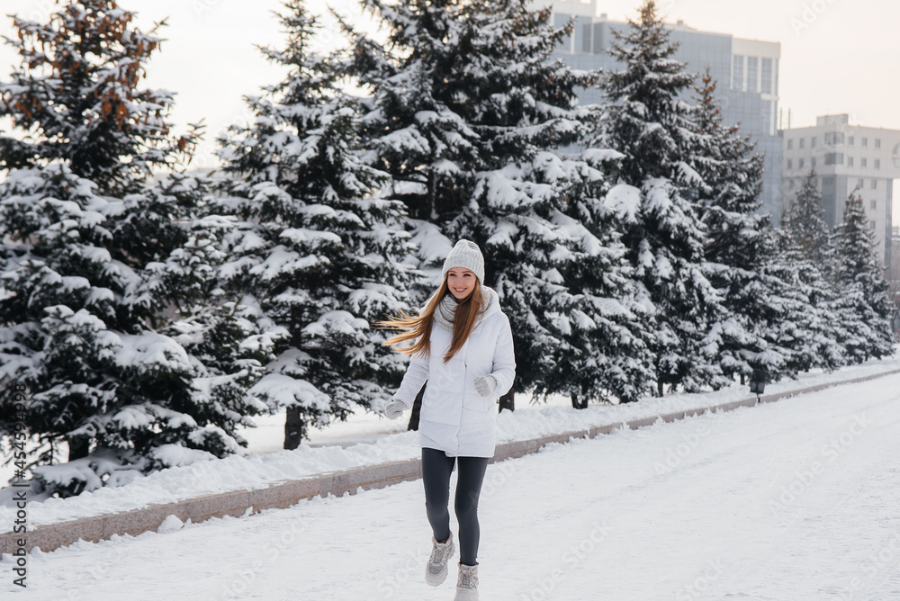 A young athletic girl runs in the park on a sunny winter day. A healthy way of life.