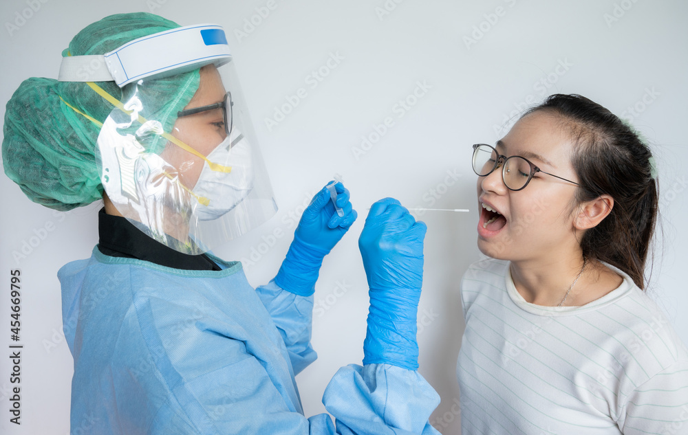 Healthcare worker trying to do oral (throat) swab by collect a sample test from Asian woman for testing diagnosis of covid-19 infection. Rapid tests look for specific proteins on the surface of virus.