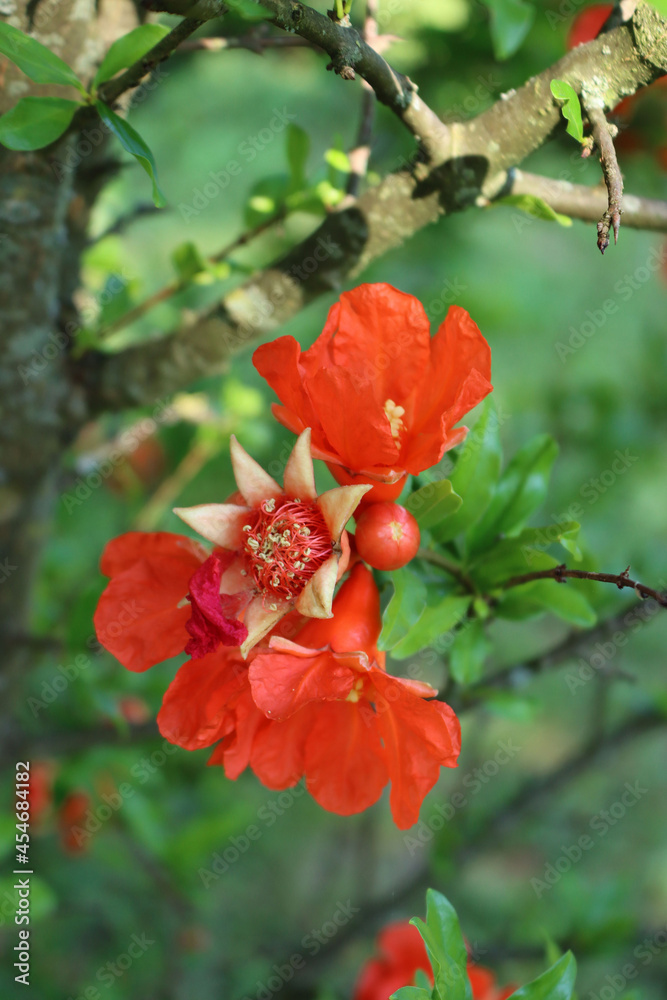 Close-up of red Pomegranate flowers on bush in the garden. Punica granatum tree on summer