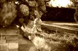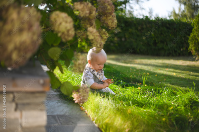 portrait of adorable baby boy in the park with green lawn is smiling next to the flowers . Happy childhood