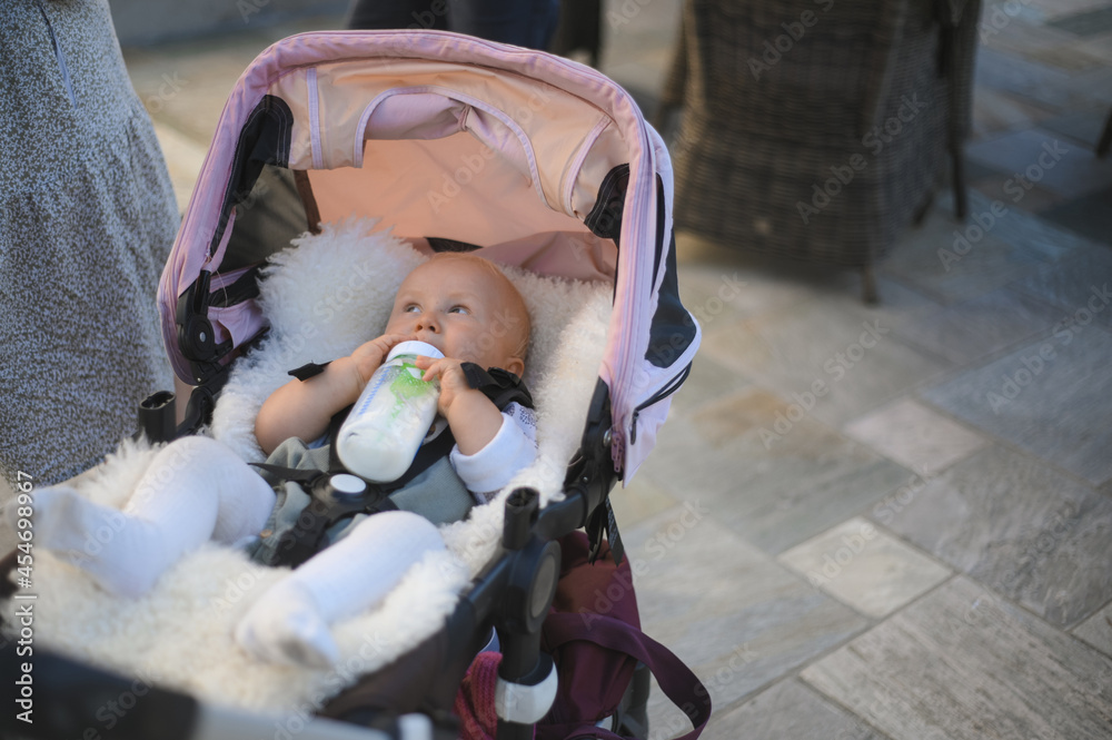 close up portrait of cute smiling baby boy drinking from the bottle milk.