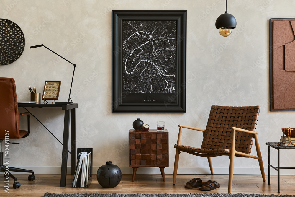 Creative composition of elegant masculine living room interior with mock up poster frame, brown armchair, industrial office desk and personal accessories. Template.