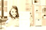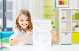 education and school concept - happy smiling student girl with school test and A grade over home room background