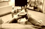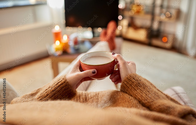 people and leisure concept - hands of young woman watching tv and drinking hot chocolate at cozy home