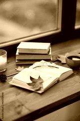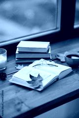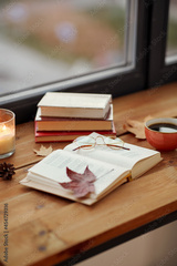 season, leisure and objects concept - open book, cup of coffee, autumn leaves and candle on window sill at home