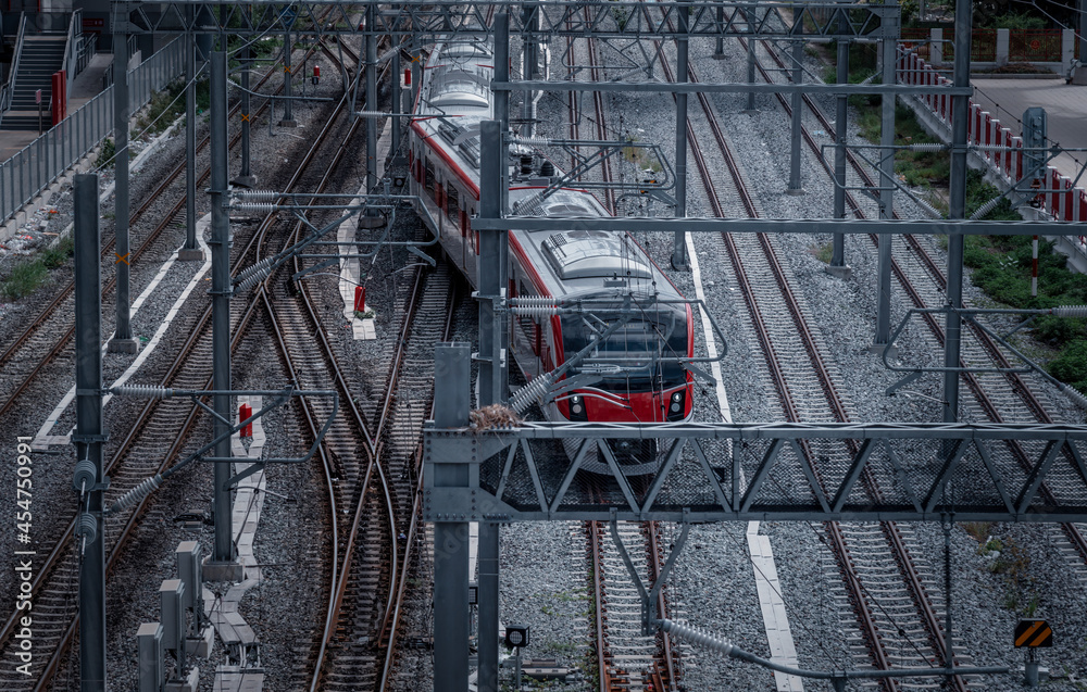 The electric train drives at high speed motion from the station with passenger and cargo to station destination is modern trasportation concept with sun light sky background.