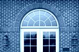 Double white glass French doors with half circle window grill design on brick building with lanterns