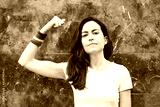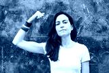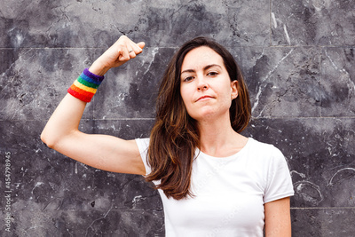 Young lesbian woman showing biceps with rainbow armband. LGBT power