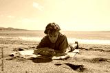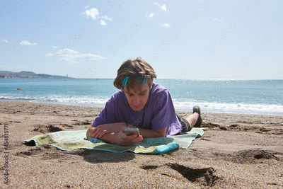 A caucasian male lying on a towel at a beach checking his phone during the day