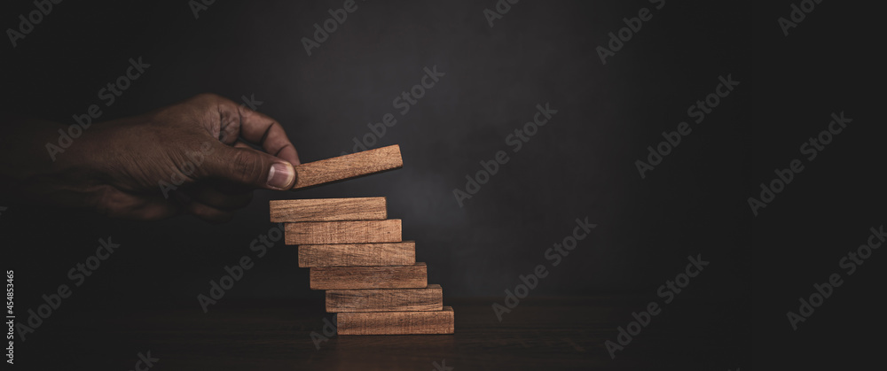 Close-up hand is placing wood block tower stacked in stair step with caution to prevent collapse or crash concepts of financial risk management and strategic planning.