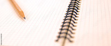Close-up notebook or note book diary with a pencil on wooden desk or boardroom table for meeting notes.