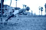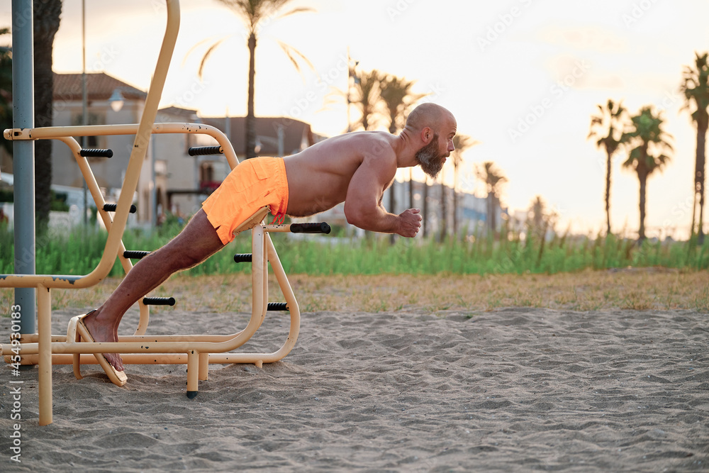 Strong athletic man doing calisthenics workout outdoors at the beach during sunset.