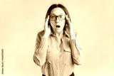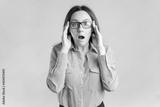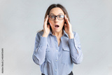 Surprised young businesswoman in eyeglasses standing in front of gray background
