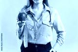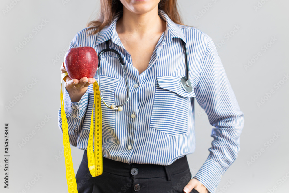 Young nutritionist holding a tape measure and an apple, looking at camera and smiling on gray background