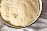 Process of raising the dough in a special basket. Dough made from natural sourdough. Wheat dough. Fermentation. Top view.