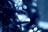 Christmas background, green pine branches festive background. Creative composition with border and copy space. New year decoration with bokeh lights from light bulbs