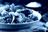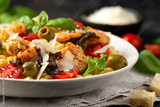 King prawn pasta salad with marinated green olives, cherry tomatoes and parmesan cheese shavings. Healthy food.