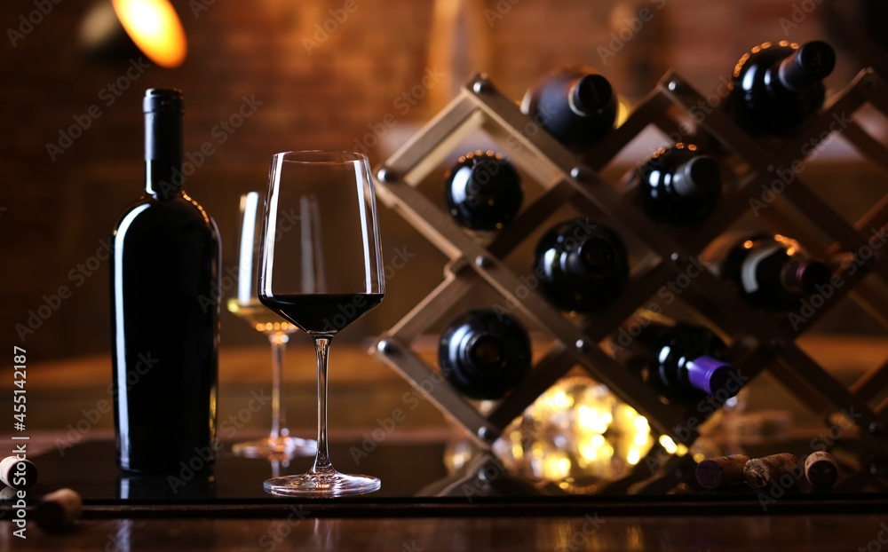 Glasses of red and white wine on table with wine bottle holder.